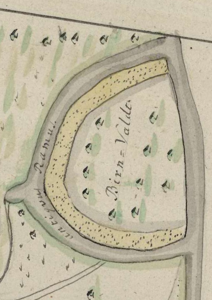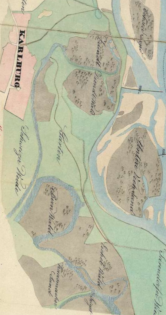Birn Wald (Kőrtvélyes) z väčšej časti obklopovalo staré Dunajské rameno s latinským názvom “Antiquus ramus” a vytváralo mu prirodzené ohraničenie. Avšak v čase keď sa tam budoval žrebčín toto rameno už bolo mŕtve, pravdepodobne vysychajúce. Bolo pozostatkom ešte z čias, keď hlavný tok Dunaja tiekol cez Rusovské rameno (Karlburger Arm).