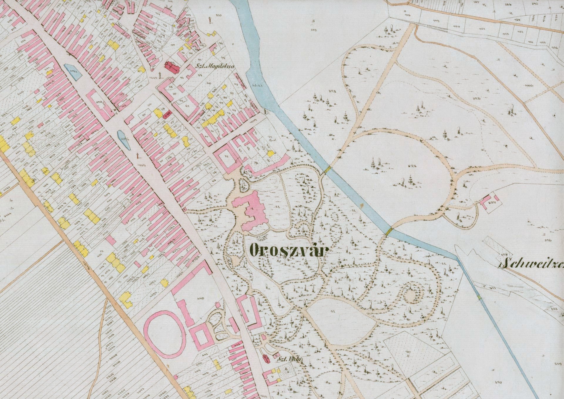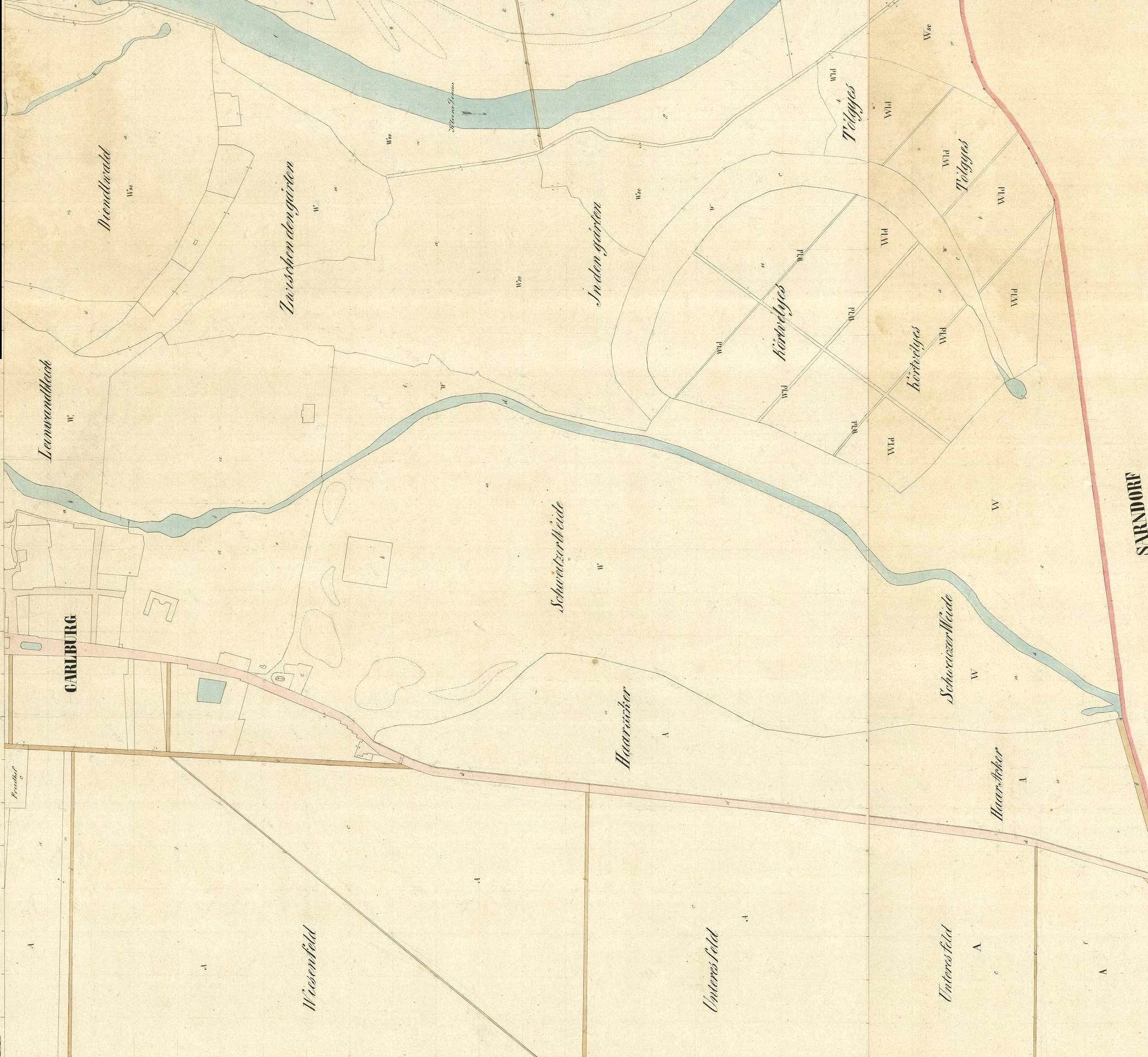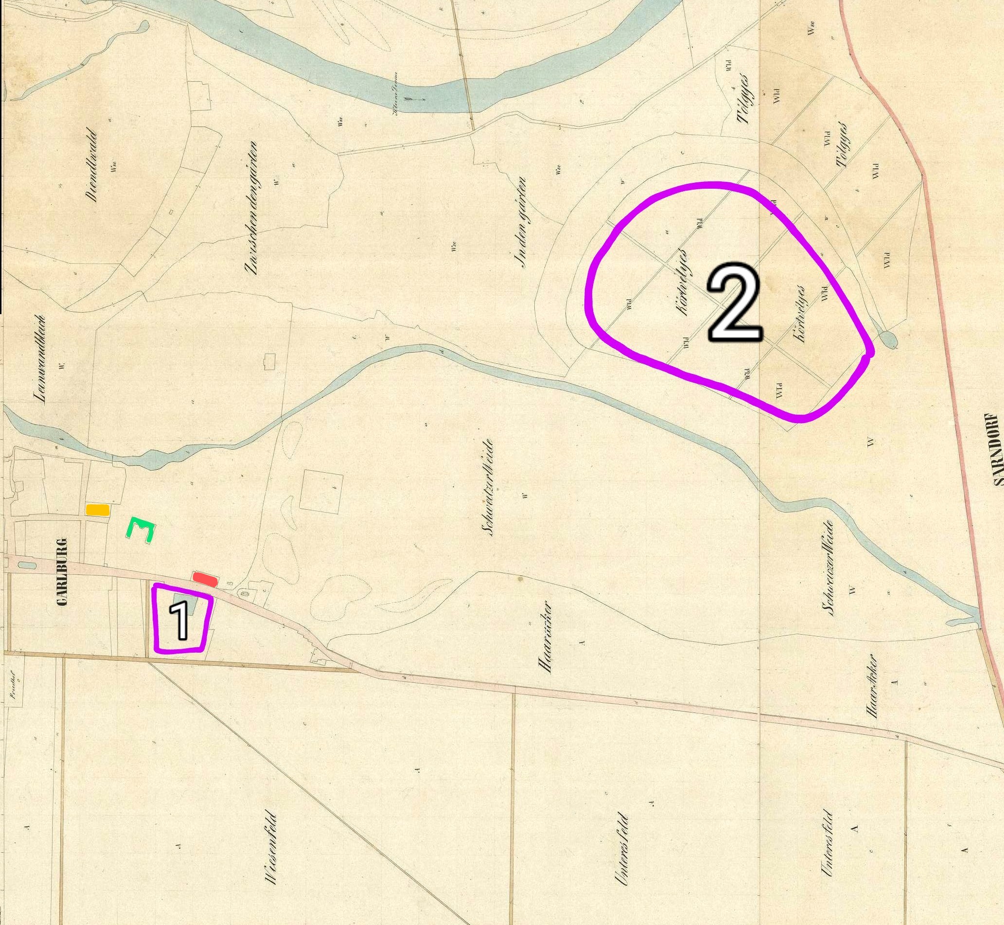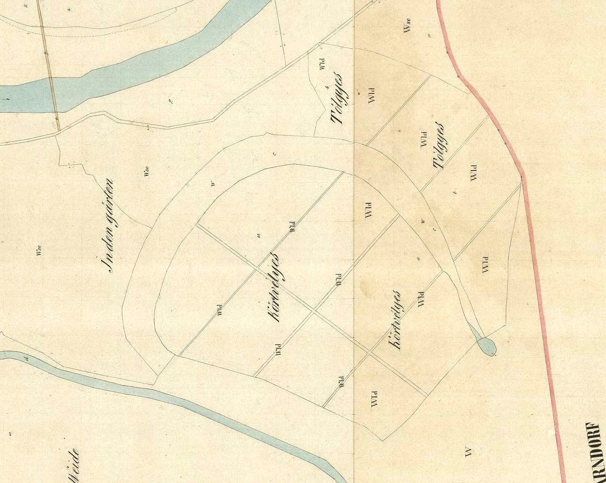 Všimnime si aj, že v okolí Kőrtvélyes (Hruškový les) sa nachádzali územia s názvami ako Tőlgyes (Dubový Les), In den Gärten(V záhradách) a kúsok za Rusovským ramenom Schweitzer Weide (Švajčiarsky pasienok).
