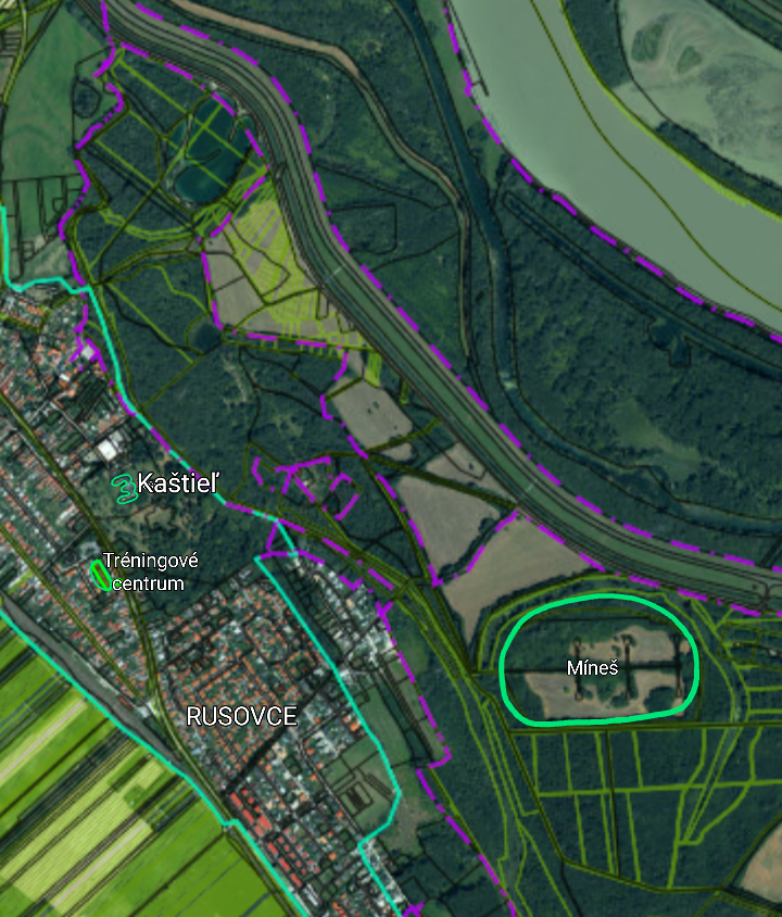 Katastrálna mapa oblasti Míneš rok 2025 (zdroj: Kataster nehnuteľností, ÚGKK SR, https://zbgis.skgeodesy.sk/)