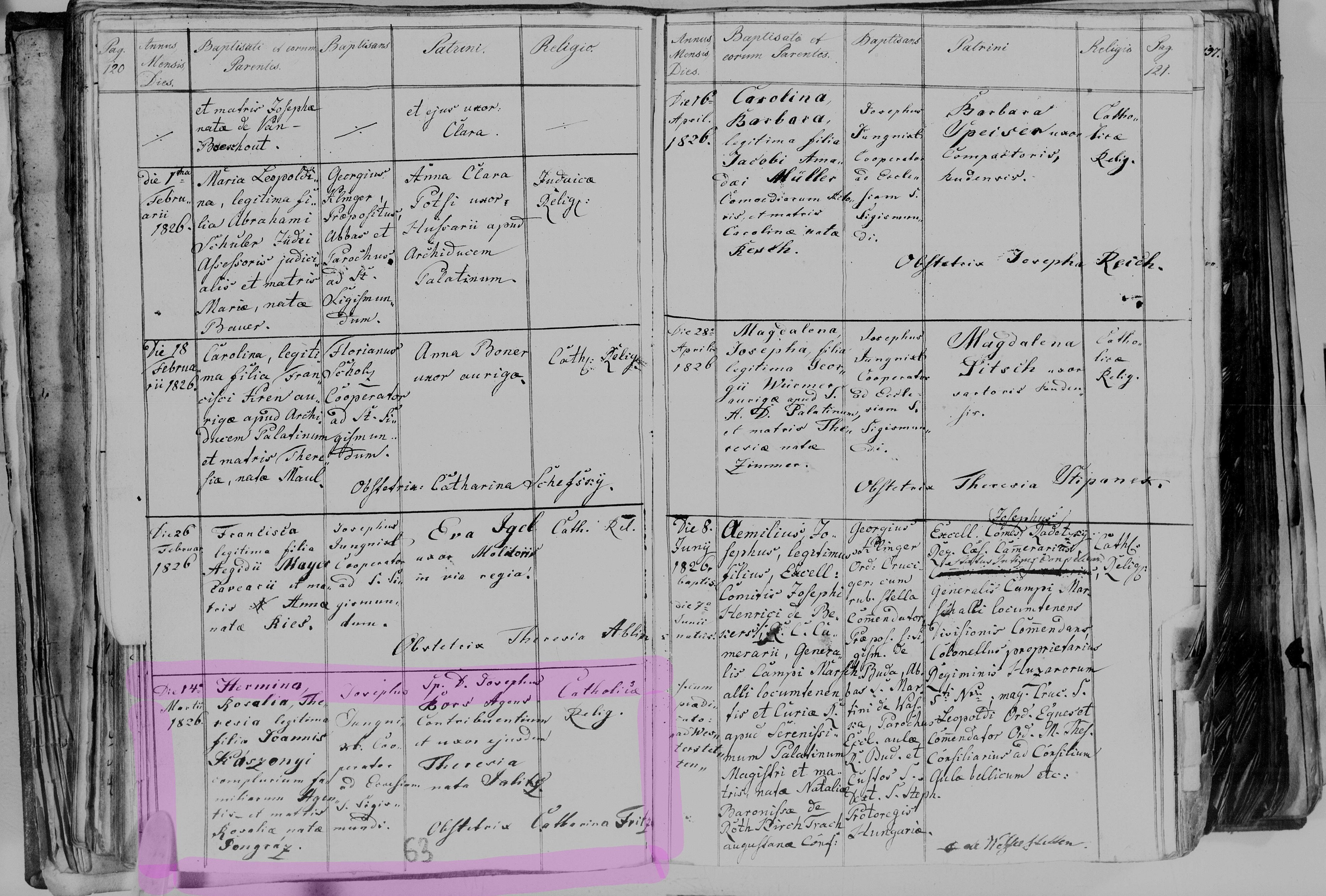 Záznam z krstu Hermíny Kászonyi 1826:
