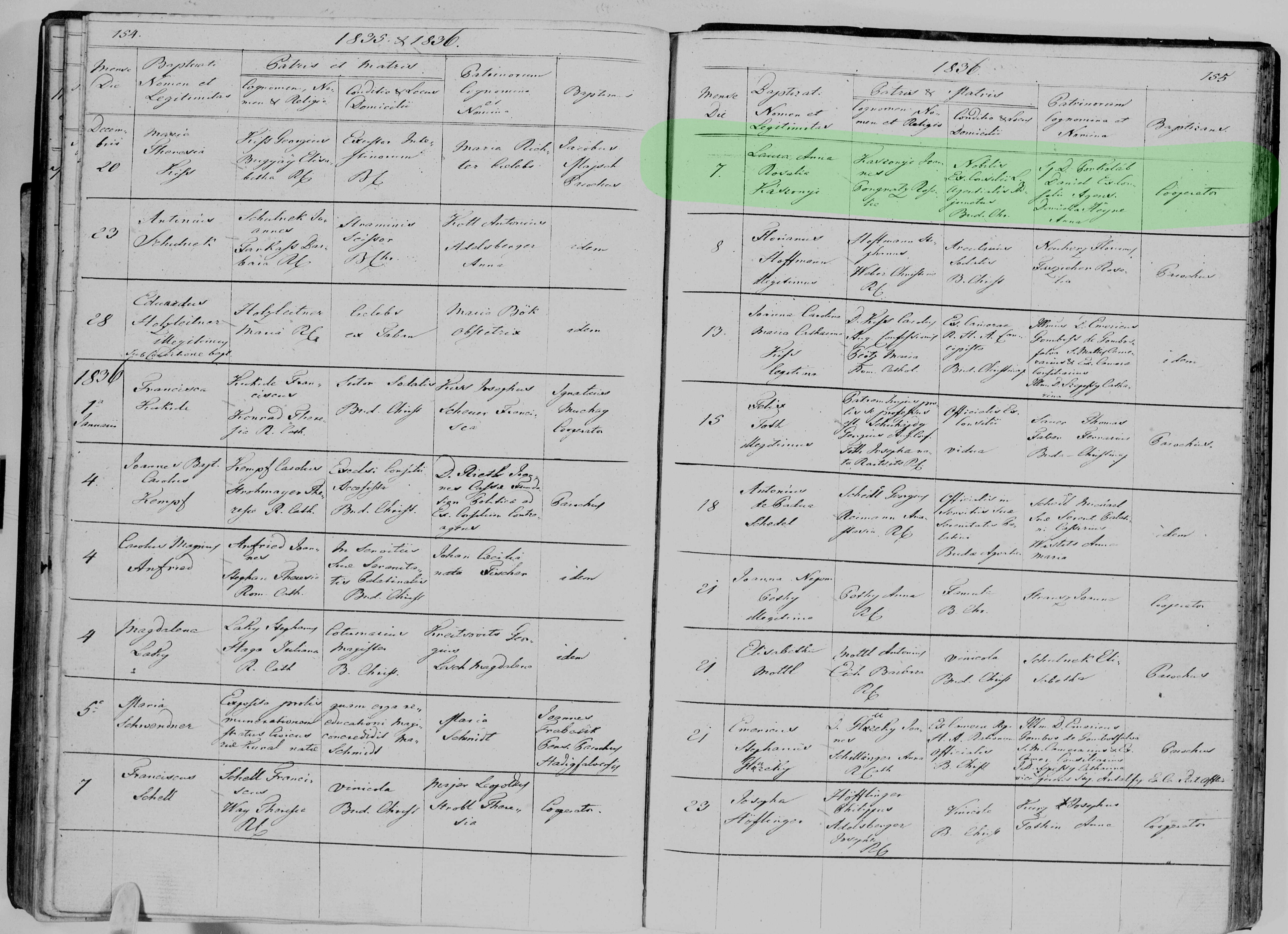 zdroj:"Hungary, Catholic Church Records, 1636-1895", FamilySearch (https://www.familysearch.org/ark:/61903/1:1:X87D-NG4 : Tue Nov 18 12:49:18 UTC 2025), Entry for Kaszonyi Laura Anna Rosalia and Kaszonyi Joannes, 1836.